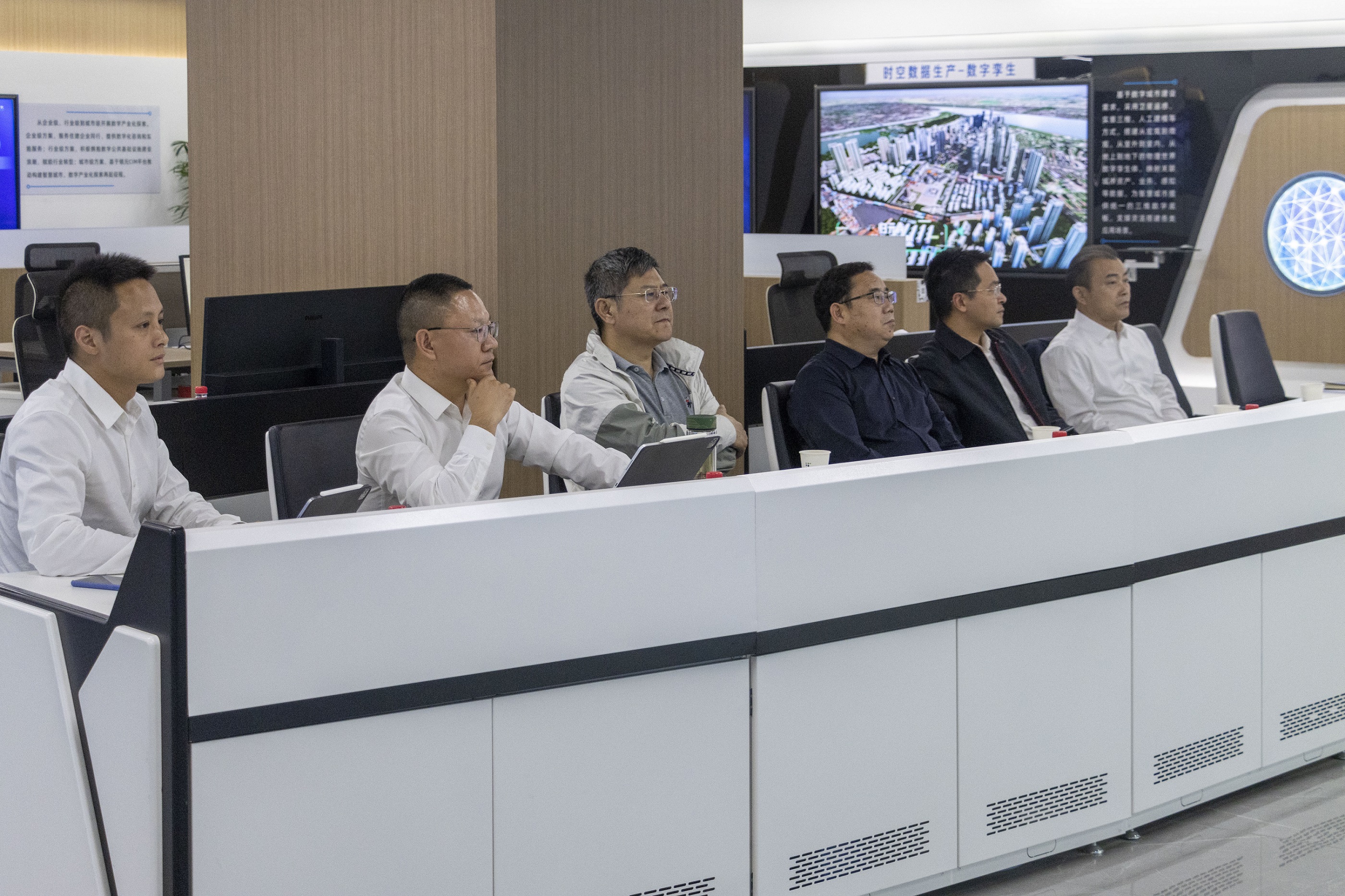 ? ? 在智能化展廳,一行人了解了匯科智創(chuàng)公司在智能建造、城市運(yùn)維兩大領(lǐng)域的多項(xiàng)先進(jìn)智能化設(shè)備,以及結(jié)合設(shè)備打造的裝配式一體化數(shù)字孿生沙盤,一端信號觸發(fā)兩端同步感應(yīng)等技術(shù)。