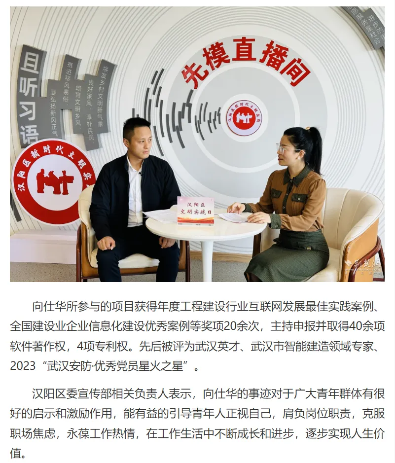 近日,漢陽(yáng)市政匯科智創(chuàng)常務(wù)副總經(jīng)理向仕華受邀參加“武漢以我為榮”:漢陽(yáng)區(qū)文明實(shí)踐日暨“感悟先模精神 汲取奮進(jìn)力量”主題宣講活動(dòng)。在“先模直播間”中,向仕華將個(gè)人心路成長(zhǎng)變化與匯科智創(chuàng)發(fā)展歷程相結(jié)合,向廣大青年作傾情分享并提供導(dǎo)向建議。